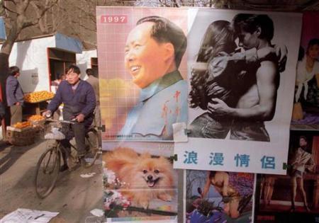 1996年12月12日,北京,市场上出售的各式挂历。挂历是日历与年画的结合品,在上世纪80年代到90年代初期风靡全国,是馈赠亲友的重要礼品。
